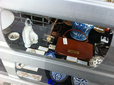 I hunted the motive for many days. The wonderful bear figure was placed different places in the shop window and added some drama to the exhibition. However one day it was placed near a beautiful Russian copy of a Luftwaffe Leica camera.